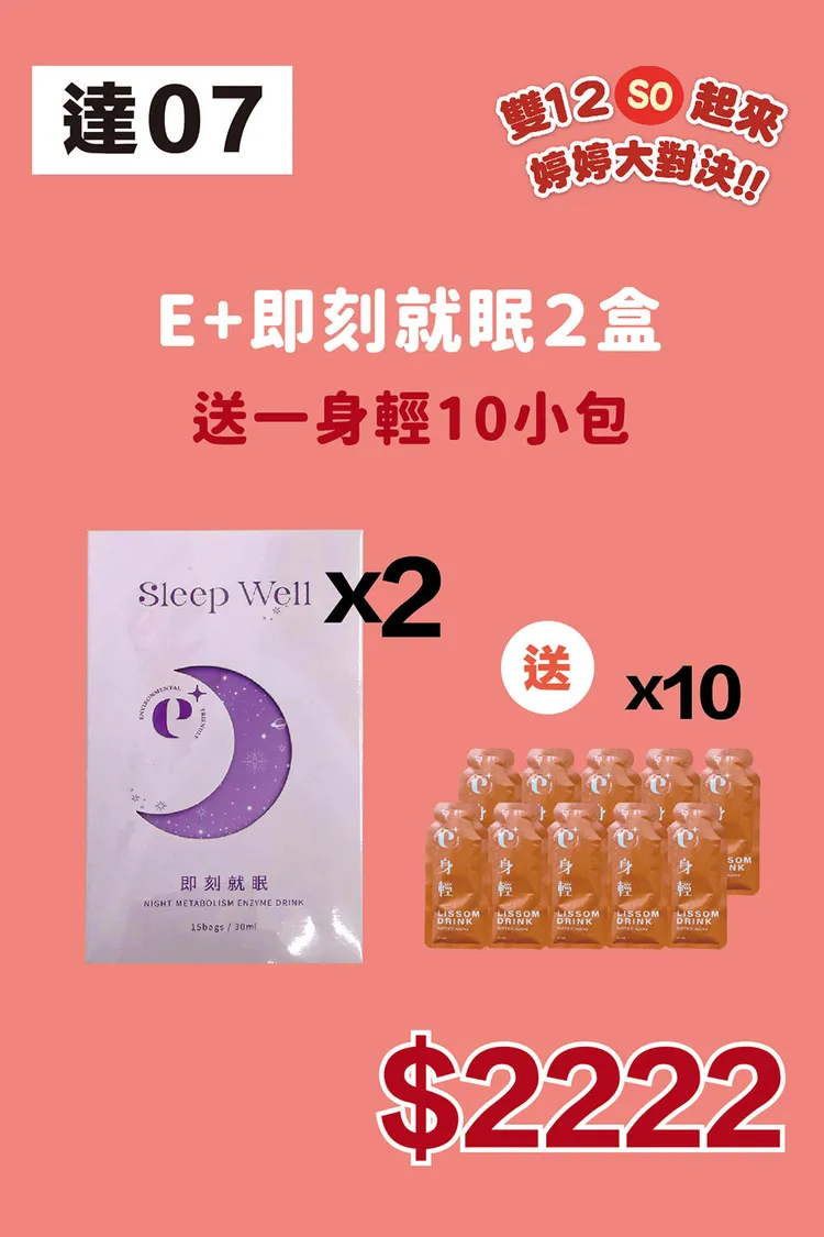 :組合內容: E即刻就眠*2盒+E身輕*15(散包)E+即刻就眠 15bags / 30mlNIGHT METABOLISM ENZYME DRINK(天天睡的沉,起床好精神)🌙夜晚休憩充飽電⚡🌞白天活力好氣色😊全效好入眠配方✦九大舒眠配方✦六大輔助元素 E+(一)身輕 15包/盒 清除體內負擔找回纖氣外表 「好好愛自己」從內在開始保養 養出健康與美麗食用方式: 一天一包 / 餐後食用